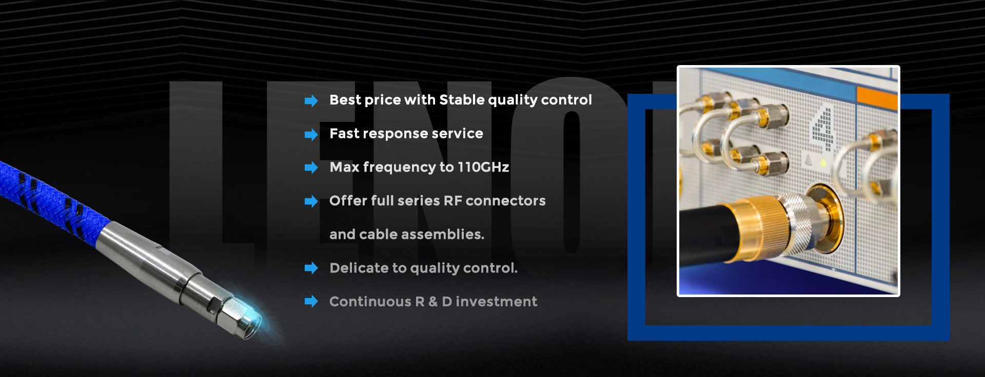 Our company, Zhejiang LenoRF Industry co. LTD, occupies an area of 30 hectares and is equipped with world class equipment to make millimeter wave connectors and phase stable cables. We specialize in coaxial connectors, cable assembly, and passive devices. Our current products are the latest millimeter wave connector and phase stable cable on the market.